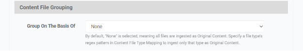 Note: Selecting Grouping File: None restricts mapping ingested files solely to Original Content. Define a file type's regex pattern in Content File Type Mapping to ingest only that specific type as Original Content.