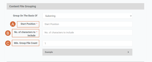 6. Click on the arrow to reveal Advance Settings. 7. Content File Grouping As part of your content ingestion process, you can configure file grouping to organize your files better. To understand the concept, refer to "Content File Grouping."