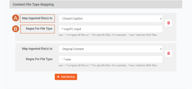 - Regex For File Type: Specify the regex pattern for media files section rules. Example: Regex Pattern .*.mp4 will select all .mp4 files and then store them in the chosen Media File Section. Add more by pressing "Add Section" for additional text fields. To include all files, input ".*" in the Regex pattern field.