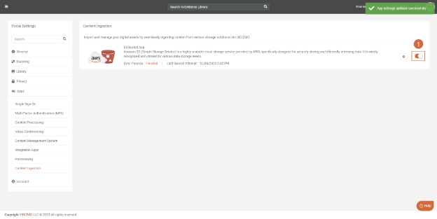 - Initiate the content ingestion process by enabling the toggle button on the content ingestion screen.