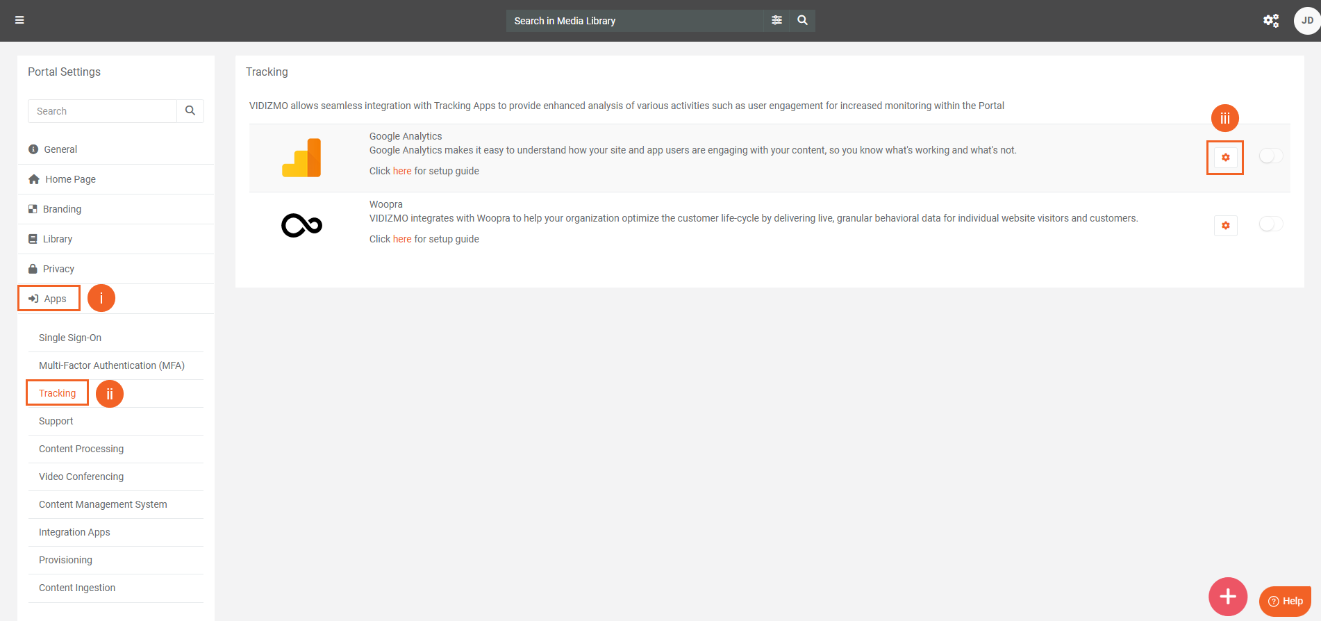 i. Click on Apps to expand the list of available operations. ii. Select Tracking to set up the Google Analytics tracking app. iii. Click on the settings icon.