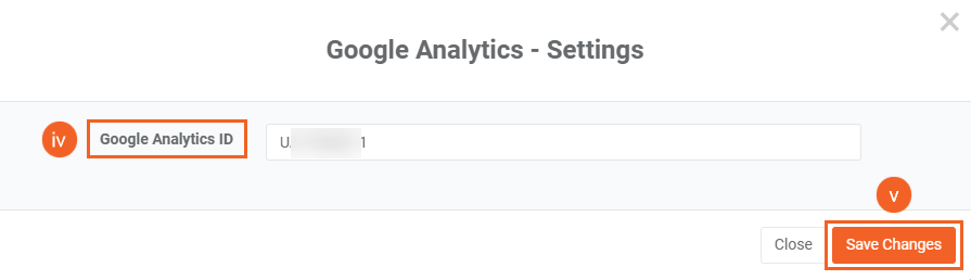 iv. In the Google Analytics - Settings popup window, enter your Google Analytics ID. v. Click on the Save changes button.