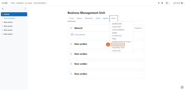 3. While in the selected Course's screen, click “More” and then select “LTI External Tools."