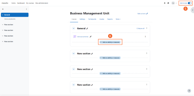 5. Now go back to your Course's screen and turn on “Edit Mode” at the top right.