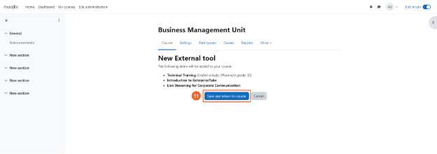 11. On the next screen, you will be able to review what VIDIZMO content you have added to the course. You can also determine which activities are graded and which are not. Click “Save and return to course” to continue.
