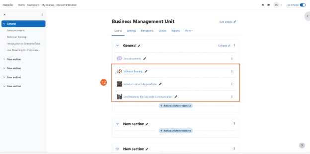 12. Back on the course screen, you can see the VIDIZMO content you have added to the course as activities. You and your audience (such as the students) can access the material by simply clicking on the title of the activities.