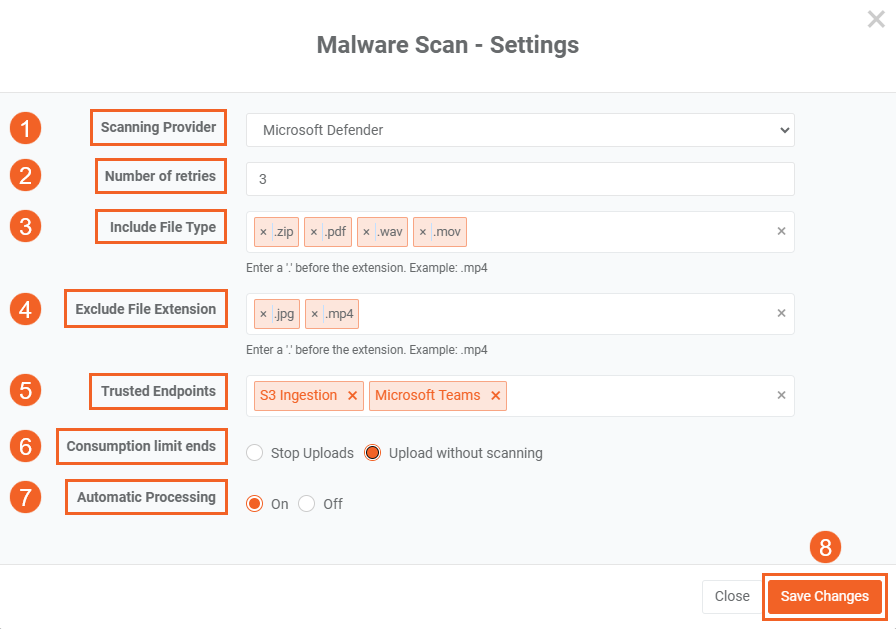 Stop Uploadsto prevent new files from being added to your Portal orUpload without Scanningto continue uploading files without scanning. - Automatic Processing: Determine if you want to enable automatic scanning of content uploaded to your Portal.
