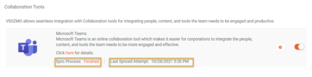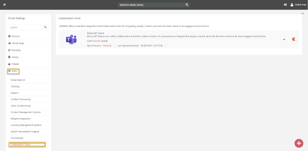 - Click on the settings icon against MS Teams to connect its app in VIDIZMO and enable its services in your portal.