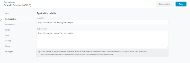 8. The next tab is the Configuration tab where you are required to list the Redirect URL. This is your Portal URL with /sso/signin-onelogin appended at the end.