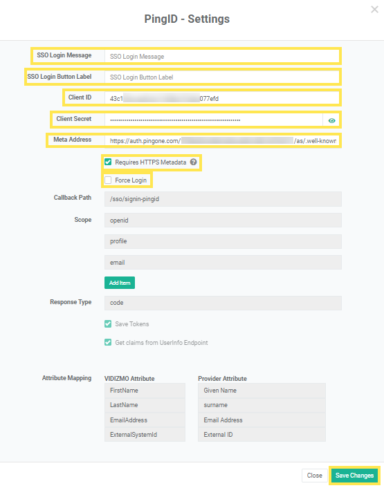1. Here you will have to map PingOne attributes to VIDIZMO Portal's attributes by reading the following article: Map PingOne Attributes. The attribute mapping allows the user information in both platforms can be synchronized after authorization.