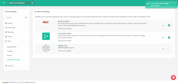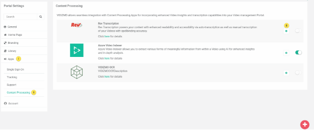 i. You can now see that the toggle button against Rev Transcription has been unblocked. Enable the toggle button to configure video insights in your portal.