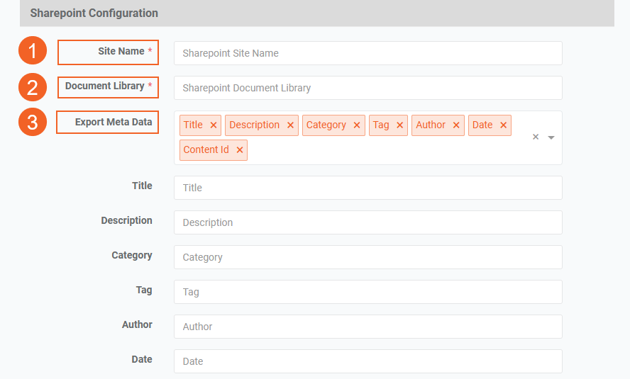 Tag: Enter the column header name for the tag field in SharePoint, representing the content file's tags. Tags will be comma-separated, and ensure the field is configured as a multiline text field to prevent data loss.