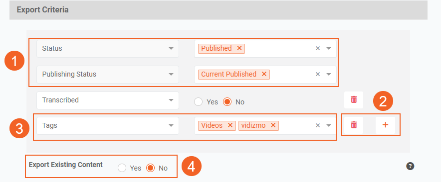 Set the export criteria by selecting fields. Choose a field (e.g., Status or Publishing Status are required). Available options depend on your VIDIZMO package, enabled applications, and any custom searchable attributes.