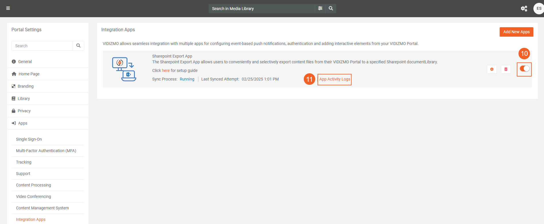 - Verify that the Export App feature is enabled in your VIDIZMO portal.