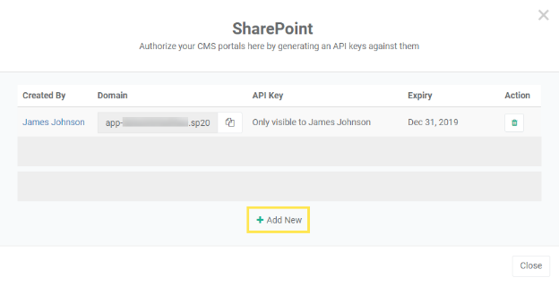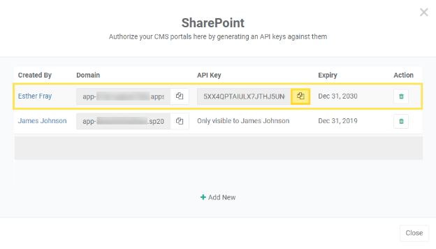 3. Next, click on the Copy icon next to your API Key to save it for later use while configuring the VIDIZMO App in the SharePoint portal. Hit Close.