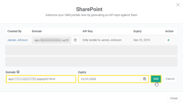ii. Enter the API authorization key you generated in your VIDIZMO portal against your SharePoint domain in Step