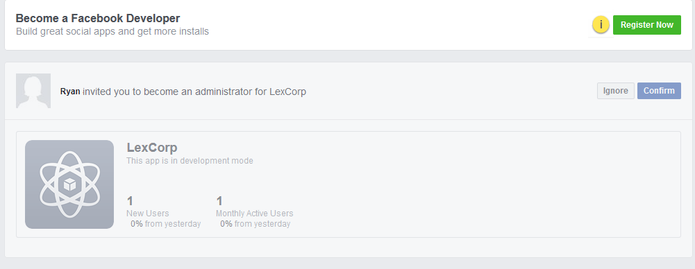- After clicking on the notification, the user is redirected to the "Become a Facebook Developer" screen to begin the registration process:
