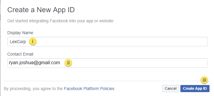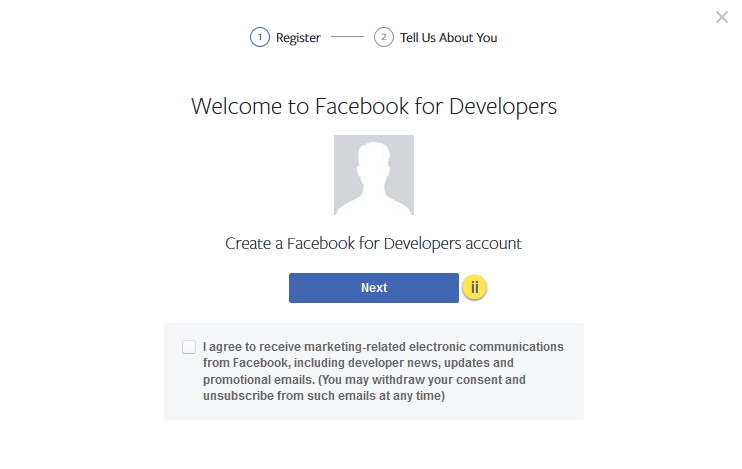- In the "Welcome to Facebook for Developers" popup window, use the **Next** button to proceed.