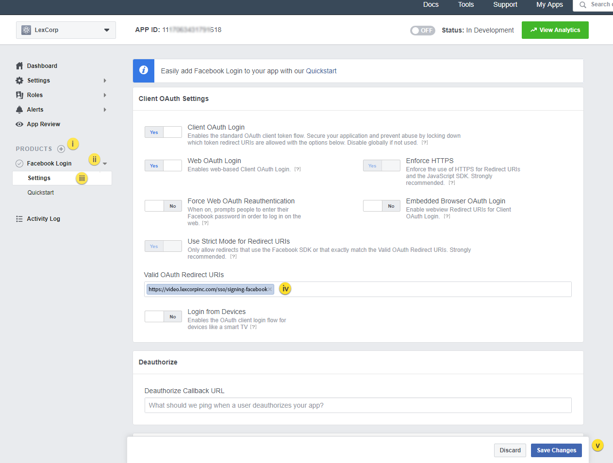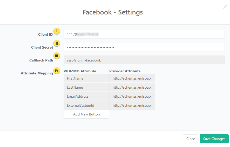 - In the Facebook SSO Settings screen, fill in the following fields: