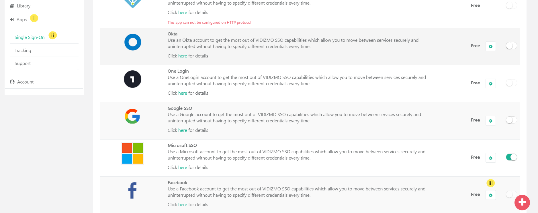 - Click on the toggle button next to Facebook to enable Facebook SSO.