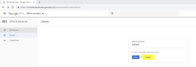 3. After successfully signing in, Google's APIs & Services screen gets loaded. If this is your first time accessing the Google APIs, you will need to create a project. Click on the Create button to create a project first.