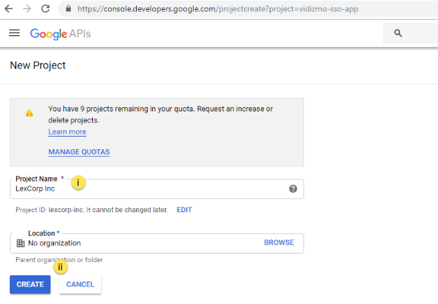 i. Enter a name for your project. Under the Location, if there is no parent organization or folder, keep the default value.