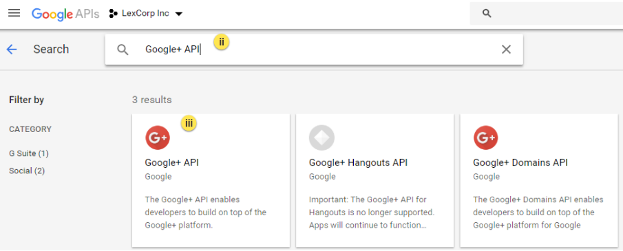 iii. Among other results from the search, select the Google+ API.