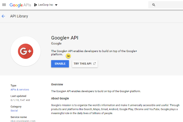 iv. On the next screen, click on the ENABLE button to enable this API for your Google API Project.