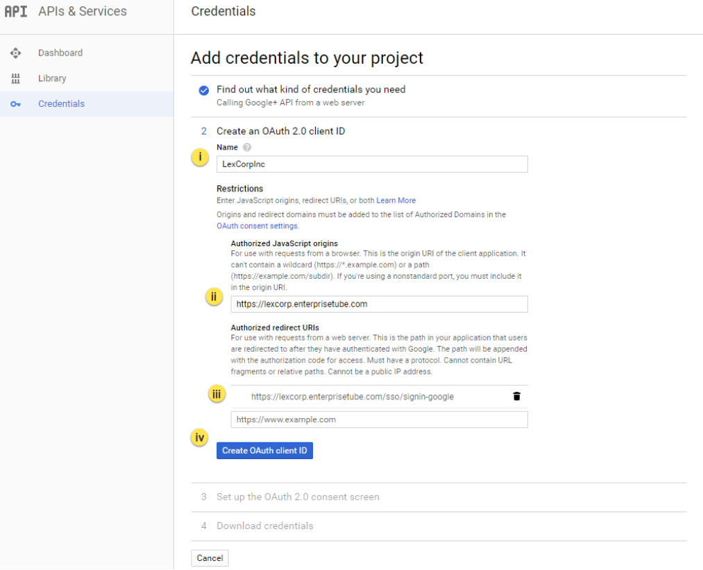 iii. You will also need the Authorized redirect URL. Your Redirect URL would be the URL of your portal with the callback path /sso/signin-google appended at the end such as: lexcorp.enterprisetube.com/sso/signin.