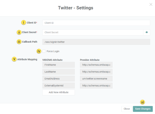 v. Attribute Mapping allows VIDIZMO to map your X(Twitter) attributes (First Name, Last Name, Email Address, etc.) to your VIDIZMO Portal. Moreover, you can choose to Add New Attribute if required, you would have to specify any user registration field that maps to an attribute exposed by Twitter. For more on user registration fields in VIDIZMO, see How to Add Custom Fields to Join Portal Form.