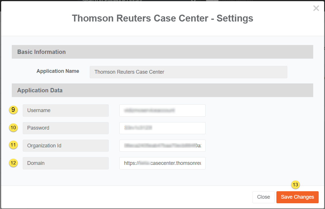 To integrate VIDIZMO with Thomson Reuters Case Center, you need the following information from your Case Center account: