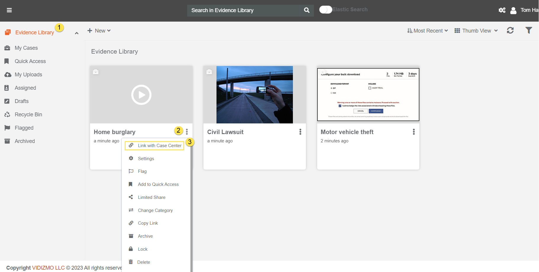 Once the Thomson Reuters Case Center app is integrated and enabled, you can link VIDIZMO cases with Case Center cases and send evidence from VIDIZMO to Case Center.