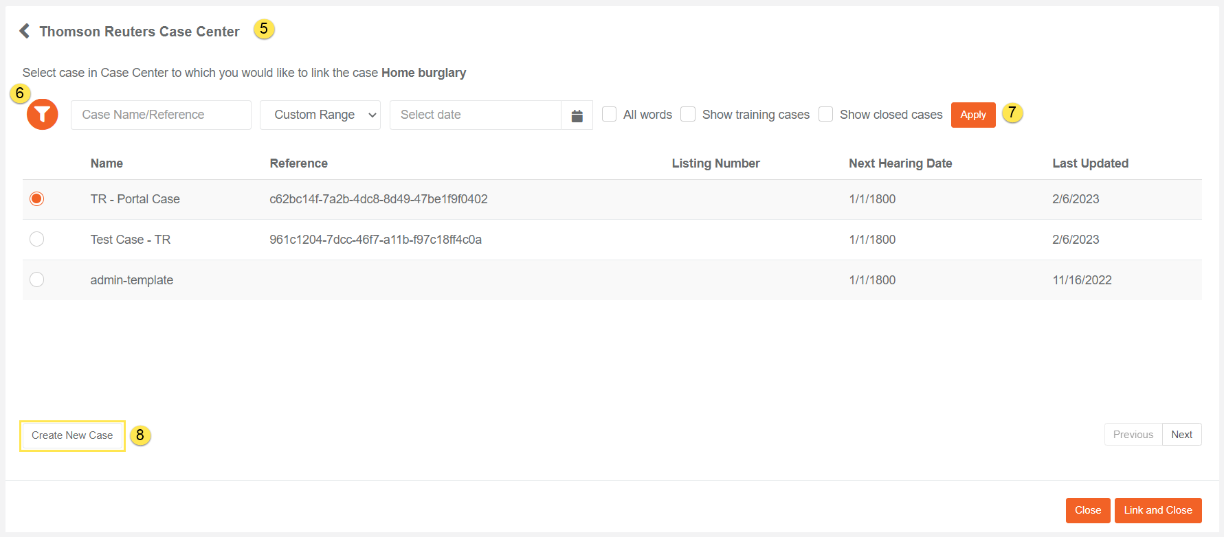 - Filter cases by name, hearing date range, or use the options to show training cases and closed cases. Select Apply to filter.