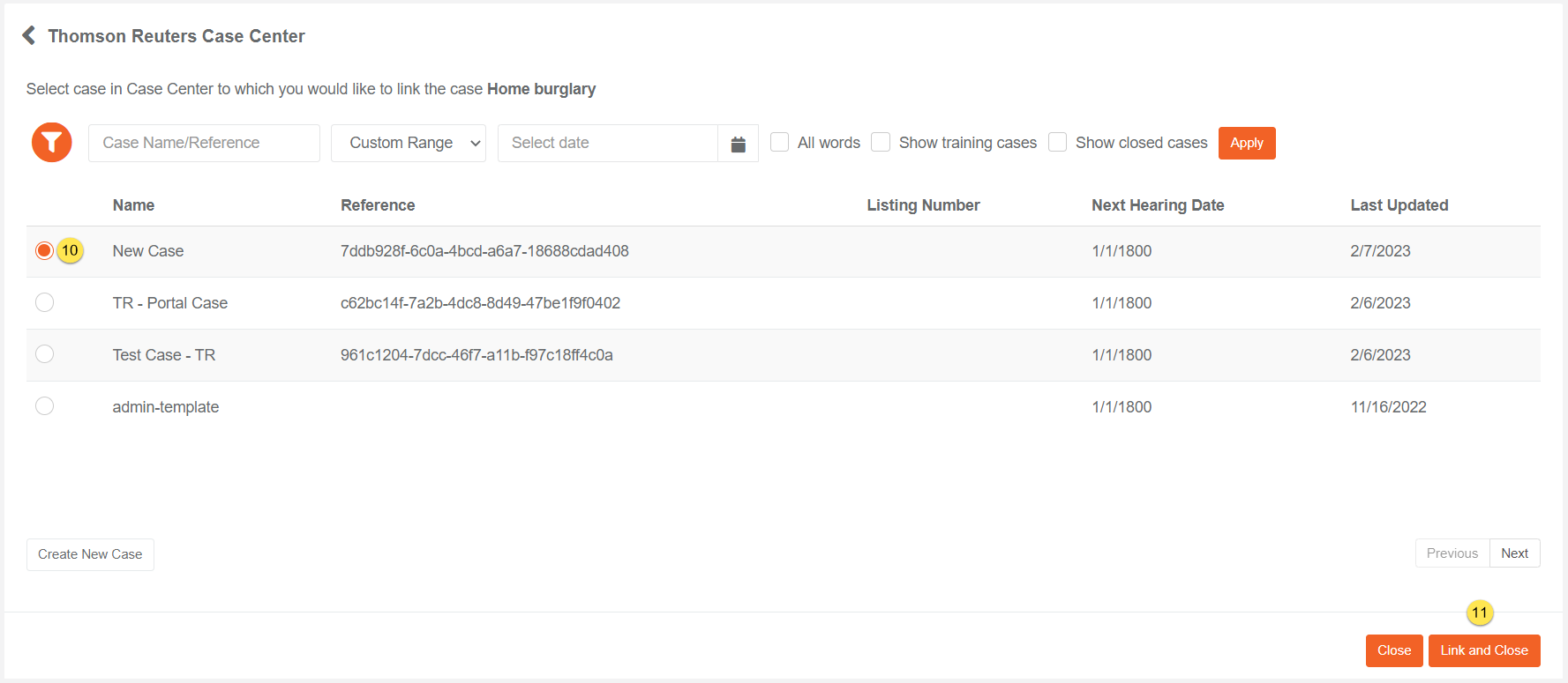 In the case list, a tag will appear on linked case “Linked with Case Center.”