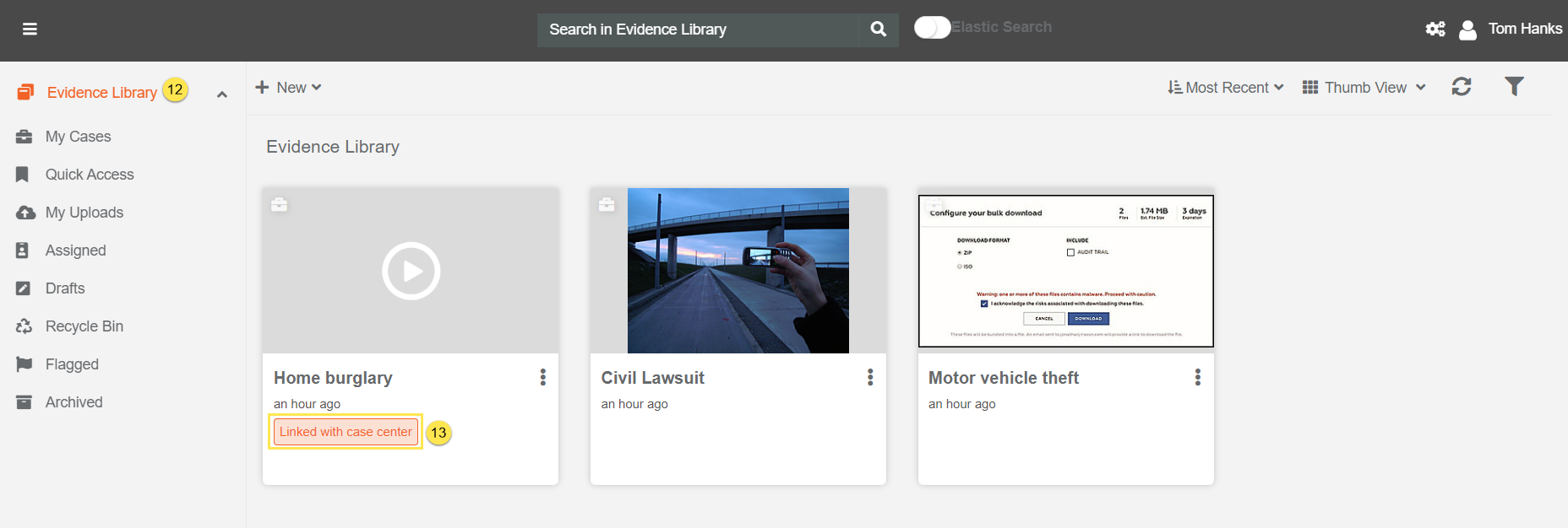 Once linked, a Linked with Case Center tag appears on the case in the Evidence Library.