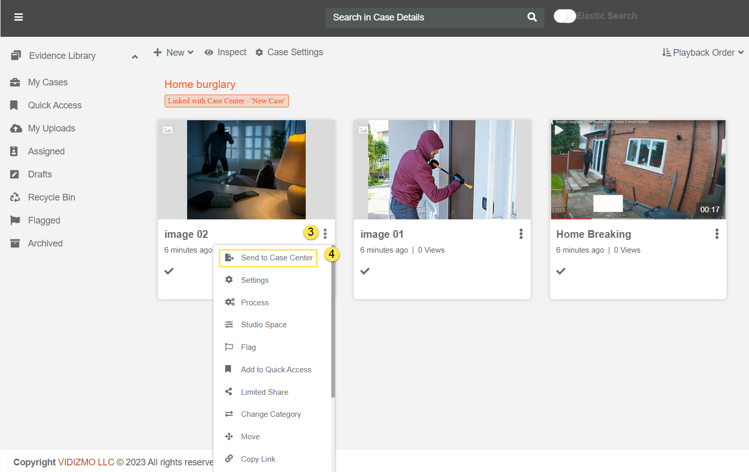 After a VIDIZMO case is linked with a Case Center case, you can send evidence from VIDIZMO to Case Center.