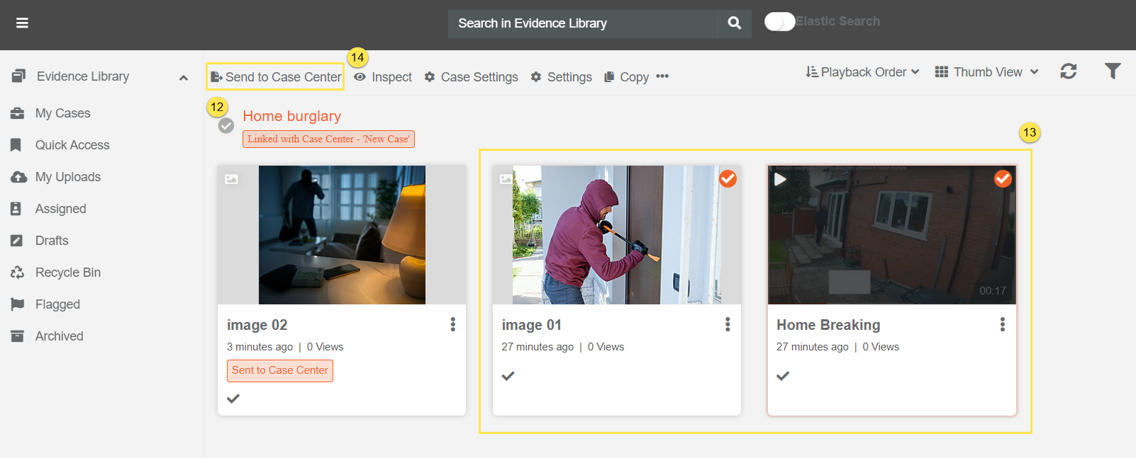 - In the Case Detail page, select individual evidence items using the checkboxes.