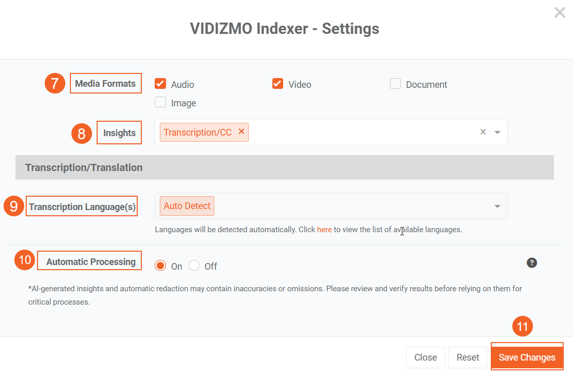 Choose the Media/Evidence formats you want to generate AI Insights for. Available insight options depend on the selected format(s).