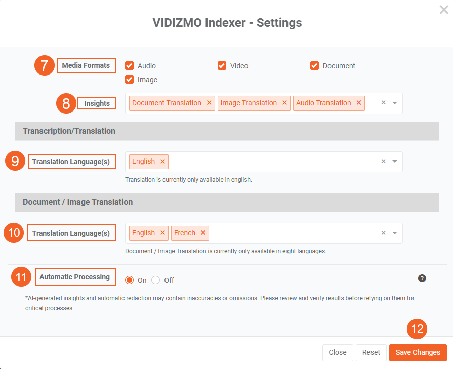 - Choose the Media/Evidence formats you want to generate AI Insights for. Available insight options depend on the selected format(s).