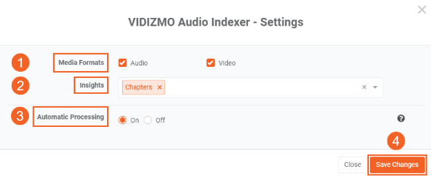 - Automatic Processing: Select the option to turn automatic processing on or off. If the "On" setting is chosen, any uploaded content will undergo automatic processing for the selected AI Insights without manual intervention.