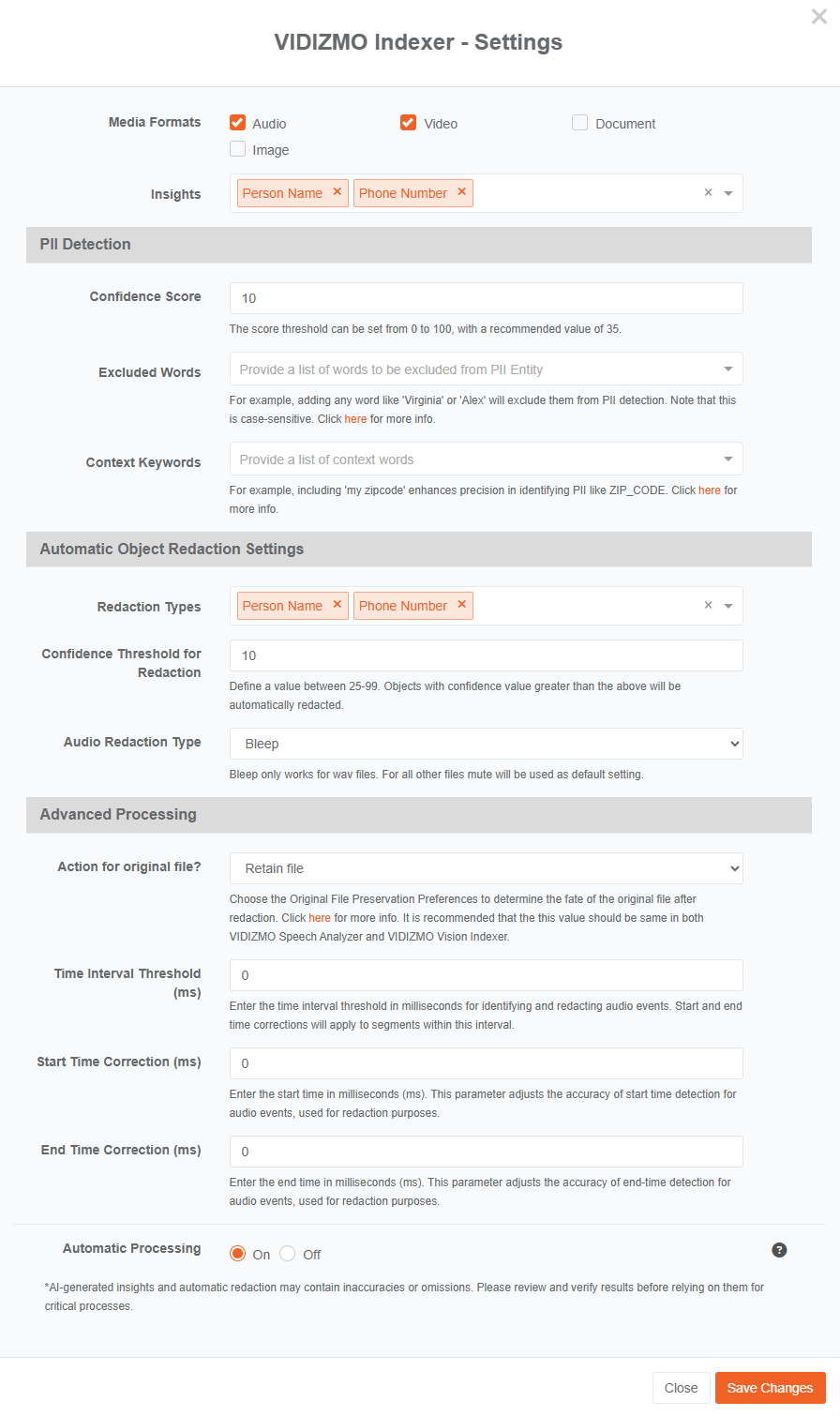 The VIDIZMO Indexer provides detection and redaction capabilities using AI models. One key capability is detecting and redacting Personally identifiable information (PII) from transcribed audio and video files.