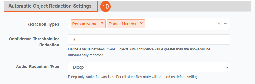 - Audio Redaction Type: Select the Audio Redaction Type to determine how PII is handled in the audio. The selected redaction type replaces the detected PII with a specific sound.