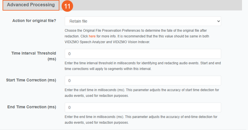 End Time Correction: Specify a value (in milliseconds) for how much the end time of a PII detection activity will be adjusted. This setting is helpful when the ending part of a PII is skipped during detection. For instance, if "Doe" is left out from the PII "John Doe," the end time correction can help in capturing the entire PII for complete classification.