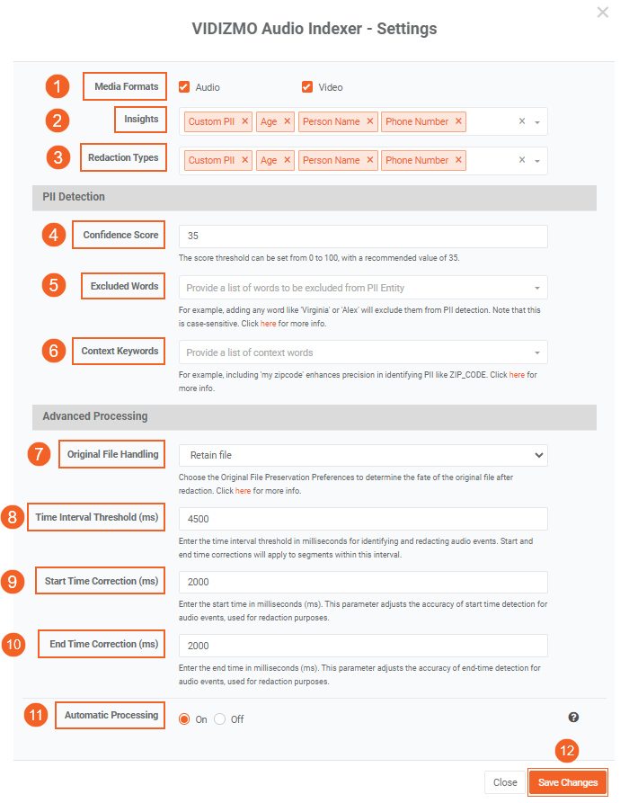 The VIDIZMO Indexer provides detection and redaction capabilities utilizing AI models. One key capability is detecting and redacting Personal Identifiable Information (PII) from transcribed audio and video files.