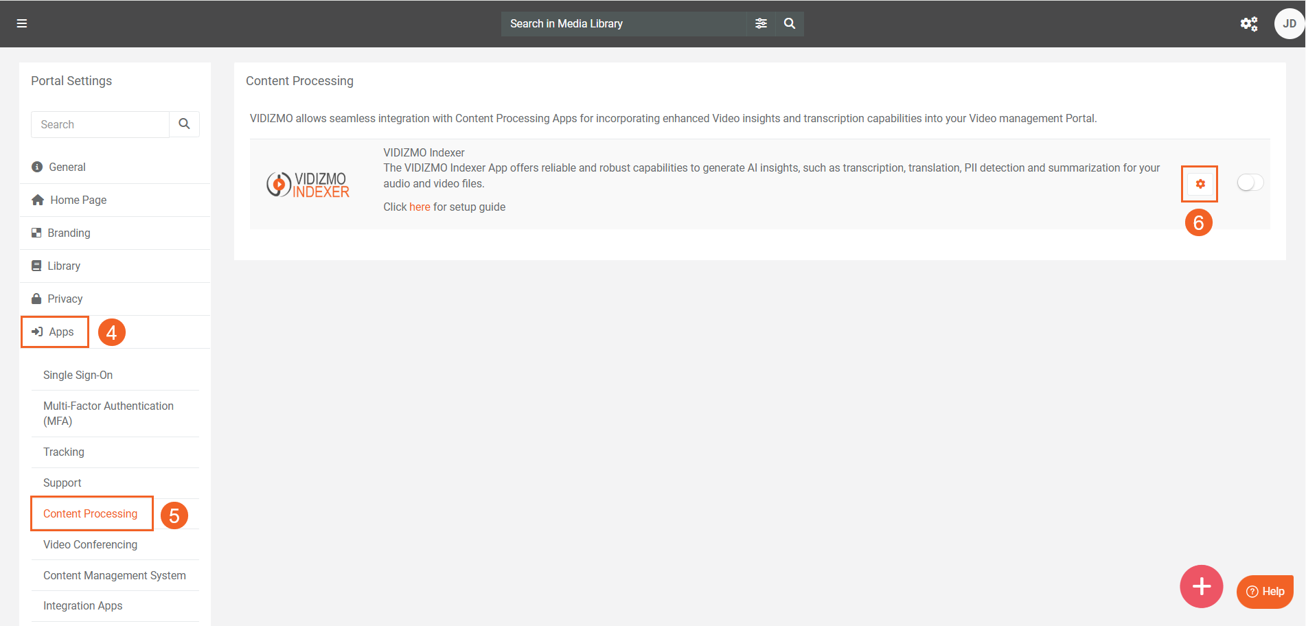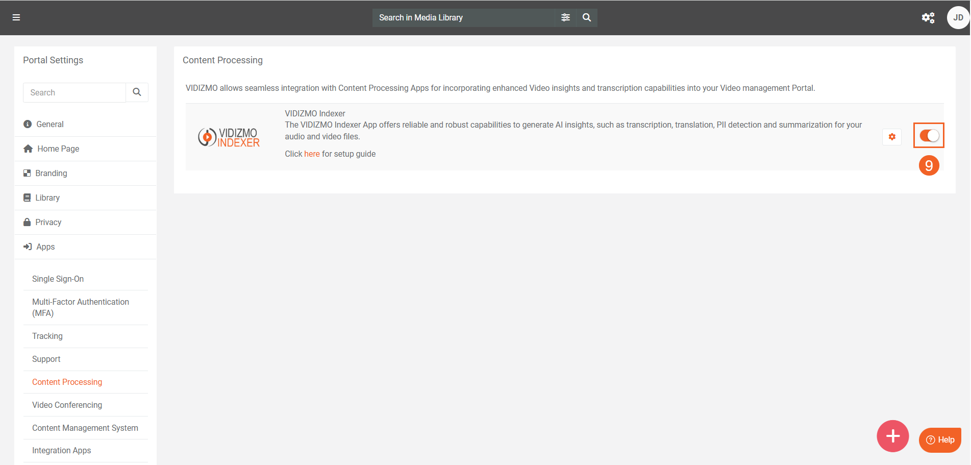 - Select Content Processing to view all the processing applications. You will find the VIDIZMO Indexer here.
