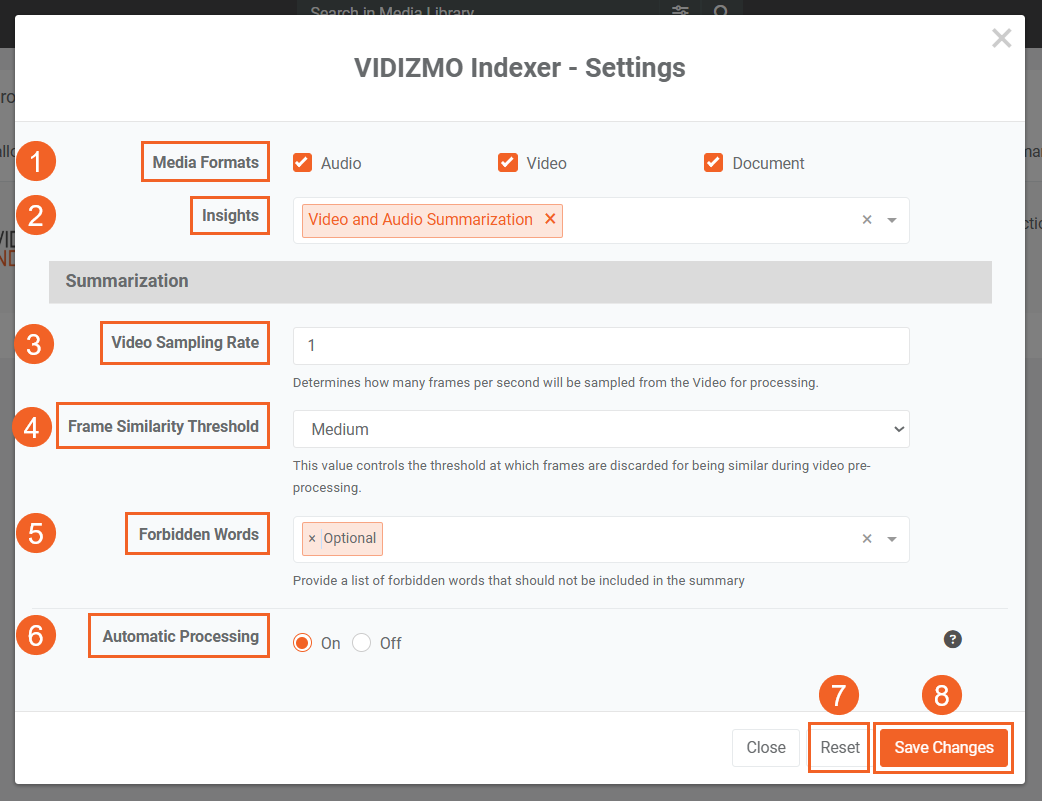 - Video Sampling Rate: Select a value from 1 to 8 (with 1 being recommended) for the sampling rate for the frames for Video Summarization. This determines how many frames will be obtained for preprocessing in one second. Adjust this value to balance processing speed with accuracy. For more information, refer to Video Sampling Rate