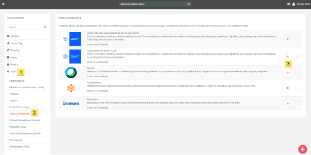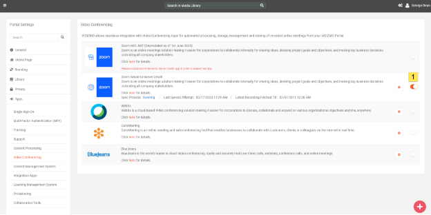 - After configuring Zoom settings, go back to the Video Conferencing Apps screen and toggle to button against settings icon to activate the Zoom App in your portal.