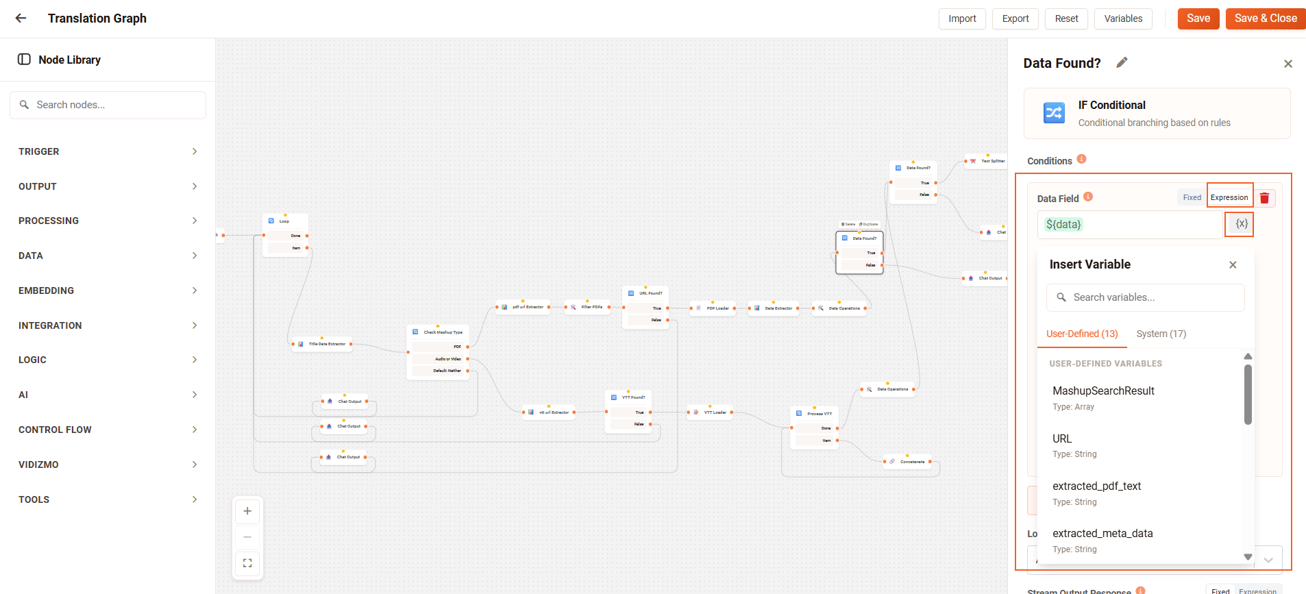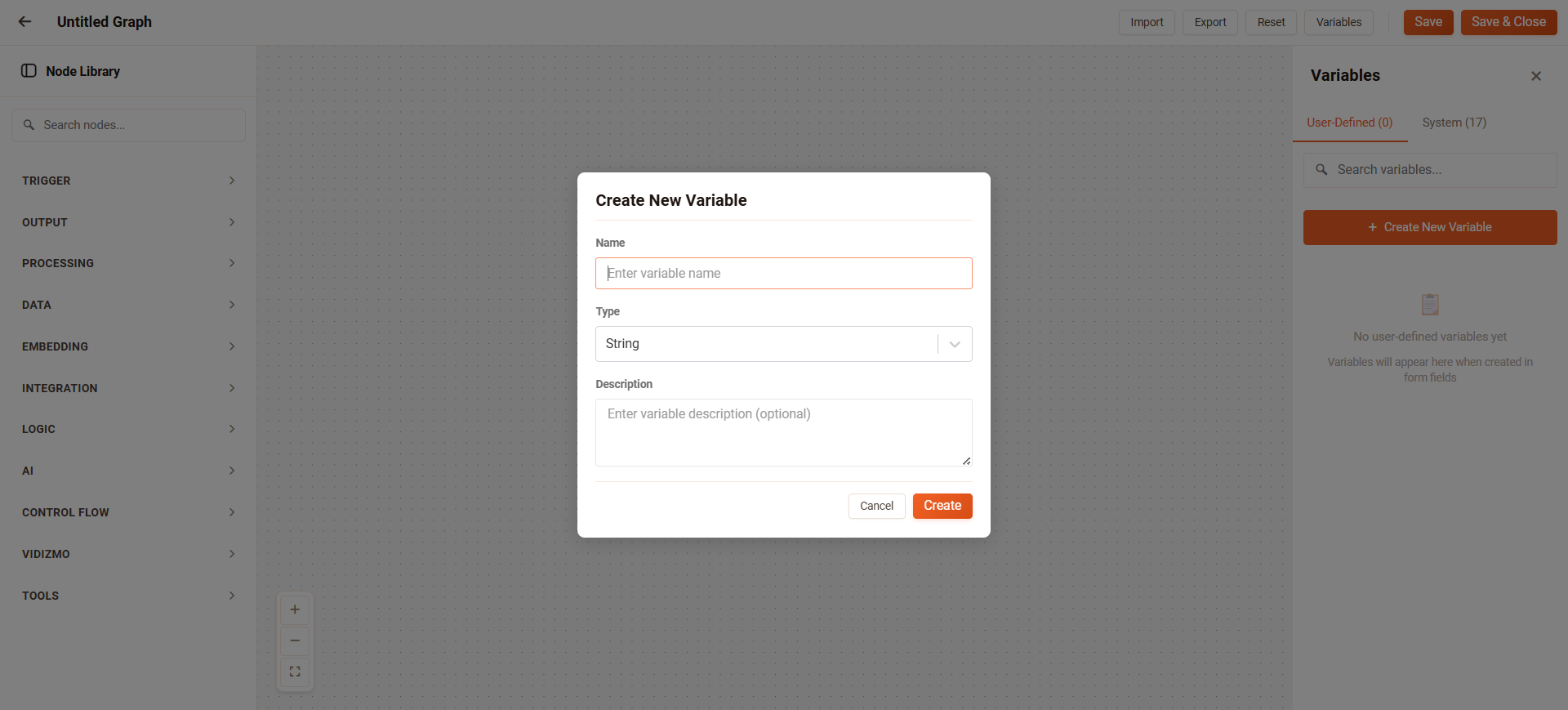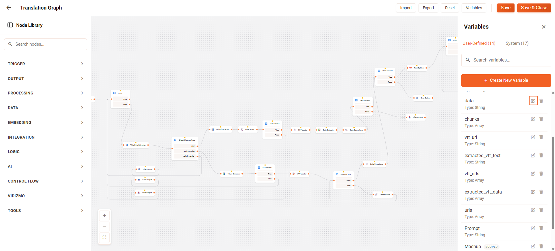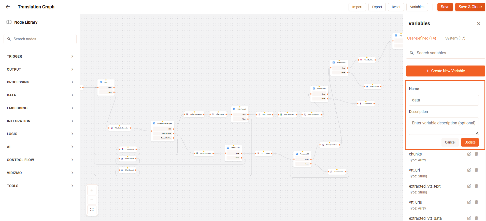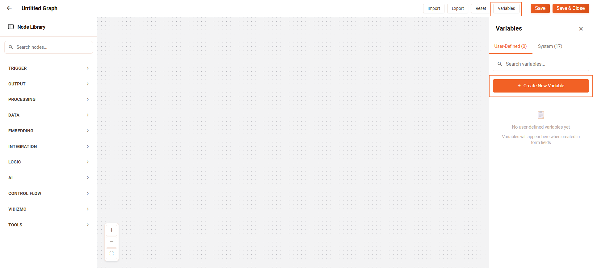 Variables in VIDIZMO Intelligence Hub allow you to store reusable values and reference them across nodes and workflows. User-defined variables provide flexibility for storing custom values, while system variables supply global context that cannot be modified.