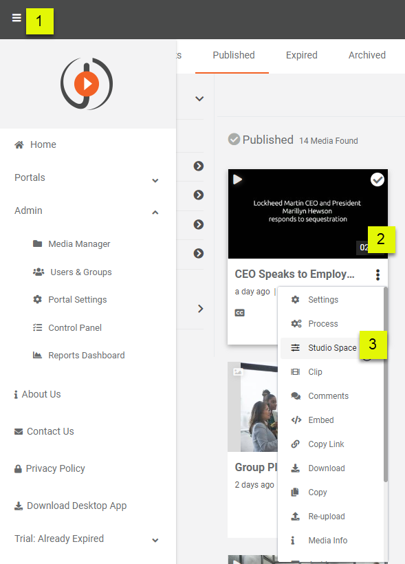 1. From the top left navigation menu, expand Admin tab and click on the Media Manager to manage your portal's media centrally. 2. After locating the video you wish to add interactive media to, click on its overflow menu.