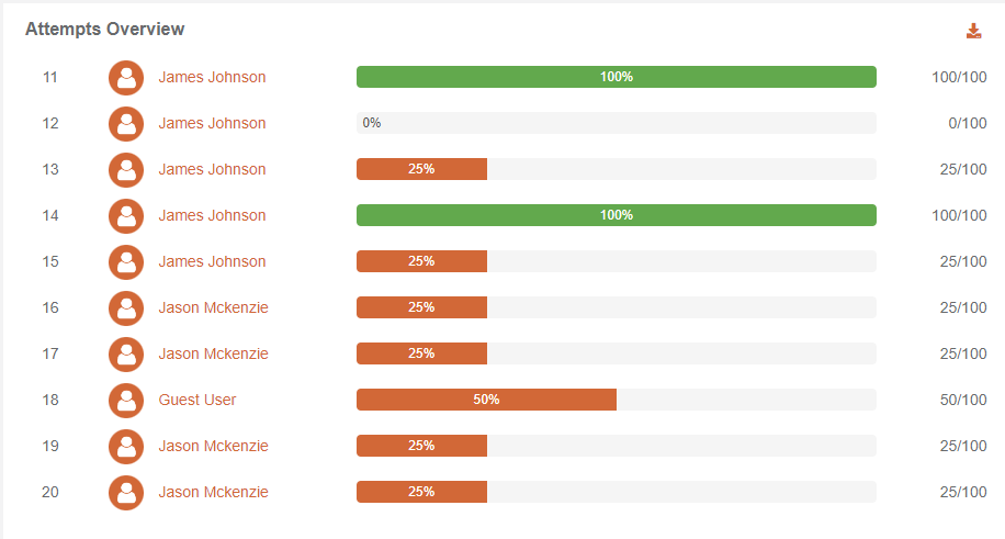 Here, you will be able to see a list of all attempts in a Quiz in a chronological order with a sleek view of performance in every quiz attempt depicting the following details: